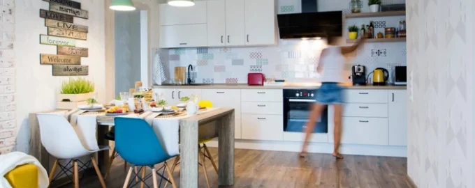 Pouze kvalitní laminátové podlahy nebudou ovlivněny pohybem nábytku, zejména častým vrtěním kuchyňských židlí, neustálým čištěním podlahy a dalšími kuchyňskými provozy.