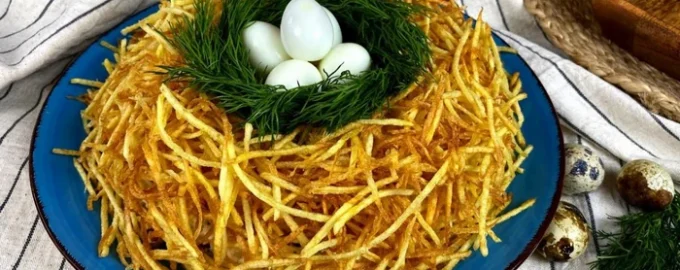 Tento krásný a chutný salát se skvěle hodí na slavnostní stůl. Originální salát „Tetřeví hnízdo“ nebo „Křepelčí hnízdo“
